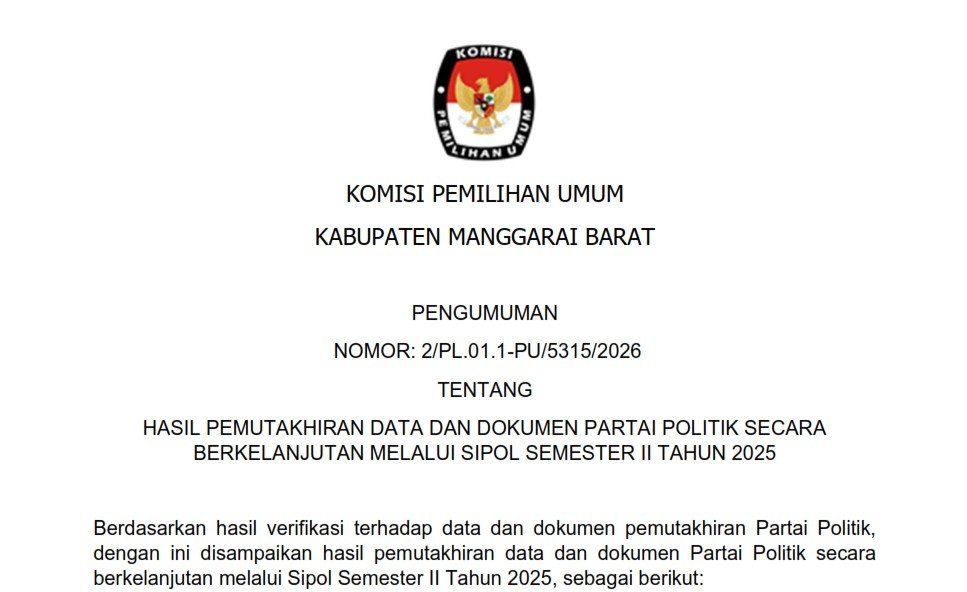 Komisi Pemilihan Umum Kabupaten Manggarai Barat mengumumkan daftar nama partai politik yang telah melakukan pemutakhiran Semester II Tahun 2025 pada aplikasi SIPOL, sebagaimana ketentuan Pasal 146 Peraturan Komisi Pemilihan Umum Nomor 4 Tahun 2022 tentang Pendaftaran, Verifikasi, dan Penetapan Partai Politik Peserta Pemilihan Umum Anggota Dewan Perwakilan Rakyat dan Dewan Perwakilan Rakyat Daerah dan Keputusan Komisi Pemilihan Umum Nomor 658 Tahun 2024 Tentang Perubahan atas Keputusan Komisi Pemilihan Umum Nomor 1365 Tahun 2023 Tentang Pedoman Teknis Pemutakhiran Data Partai Politik Secara Berkelanjutan melalui Sistem Informasi Partai Politik (SIPOL). Pengumuman dapat diakses melalui link berikut ini. HASIL PEMUTAKHIRAN DATA DAN DOKUMEN PARTAI POLITIK SECARA BERKELANJUTAN MELALUI SIPOL SEMESTER II TAHUN 2025 ....