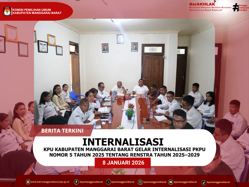 Labuan Bajo,manggaraibarat.kpu.go.id - Komisi Pemilihan Umum (KPU) Kabupaten Manggarai Barat melaksanakan kegiatan internalisasi Peraturan Komisi Pemilihan Umum (PKPU) Nomor 5 Tahun 2025 tentang Rencana Strategis Komisi Pemilihan Umum Tahun 2025–2029. Kegiatan internalisasi digelar pada Kamis, 8 Januari 2026, pukul 14.00 WITA, bertempat di Ruang Rapat Lantai 1 Kantor KPU Kabupaten Manggarai Barat. Kegiatan ini merupakan upaya strategis untuk menyamakan persepsi dan pemahaman seluruh jajaran KPU Kabupaten Manggarai Barat terhadap arah kebijakan, tujuan, serta sasaran strategis lembaga dalam lima tahun ke depan. Internalisasi Renstra ini bertujuan untuk memastikan implementasi Rencana Strategis dapat berjalan secara efektif, terukur, dan berkesinambungan, sejalan dengan tugas dan fungsi KPU Kabupaten Manggarai Barat dalam menyelenggarakan Pemilu dan Pemilihan yang mandiri, profesional, dan berintegritas. Hadir sebagai narasumber, Anggota KPU Kabupaten Manggarai Barat Kadiv Hukum dan Pengawasan, Krispianus Bheda. Dalam pemaparannya, ia menjelaskan secara rinci pokok-pokok Rencana Strategis KPU Kabupaten Manggarai Barat Tahun 2025–2029, yang meliputi visi dan misi KPU, tujuan dan sasaran strategis, arah kebijakan, hingga target kinerja yang harus dicapai oleh KPU Kabupaten Manggarai Barat selama lima tahun mendatang. Kegiatan ini diikuti oleh Ketua KPU Kabupaten Manggarai Barat, Ferdiano Sutarto Parman, serta Anggota KPU Kabupaten Manggarai Barat lainnya, yakni Azis dan Gregorius Juhardi Otto. Turut hadir Sekretaris KPU Kabupaten Manggarai Barat, Yerlingsur Nenoliu, bersama para Kasubag, yaitu Kasubag Keuangan, Umum, dan Logistik Benidiktus Bagung, Kasubag Teknis Penyelenggara dan Hukum Benediktus Hibur, Kasubag Perencanaan, Data, dan Informasi Yosefia Mujur, serta Kasubag Sosialisasi, Pendidikan Pemilih, Partisipasi Masyarakat, dan SDM Florence V. Yunita, bersama seluruh staf Sekretariat KPU Kabupaten Manggarai Barat. Melalui kegiatan internalisasi ini, diharapkan seluruh jajaran KPU Kabupaten Manggarai Barat memiliki pemahaman yang sama terhadap Renstra KPU Tahun 2025–2029, sehingga mampu menerjemahkan arah kebijakan dan sasaran strategis tersebut ke dalam pelaksanaan program dan kegiatan secara optimal dalam rangka meningkatkan kualitas penyelenggaraan Pemilu dan Pemilihan di Kabupaten Manggarai Barat. (MI/Humas KPU Manggarai Barat) ....