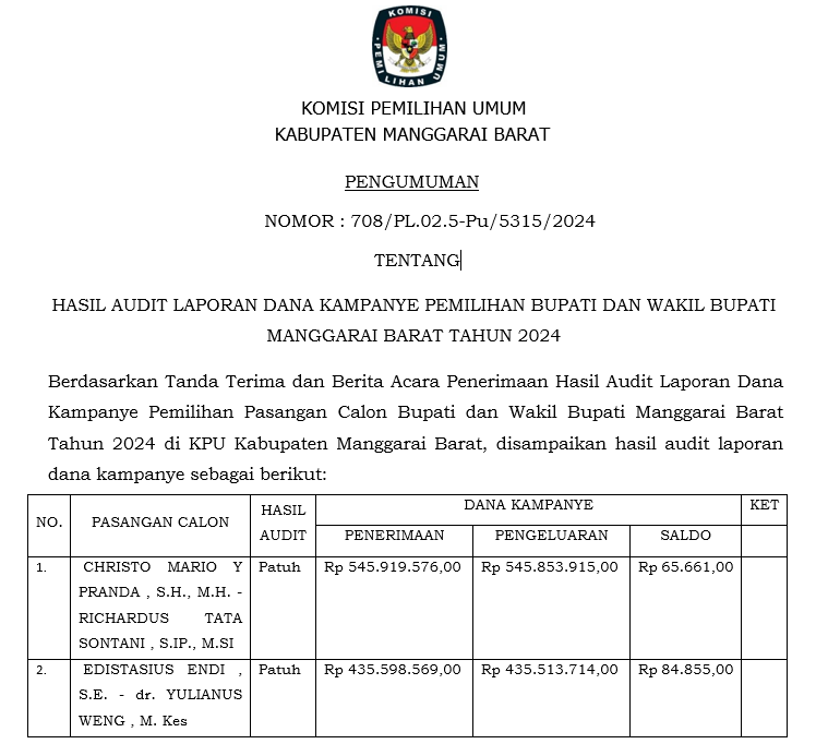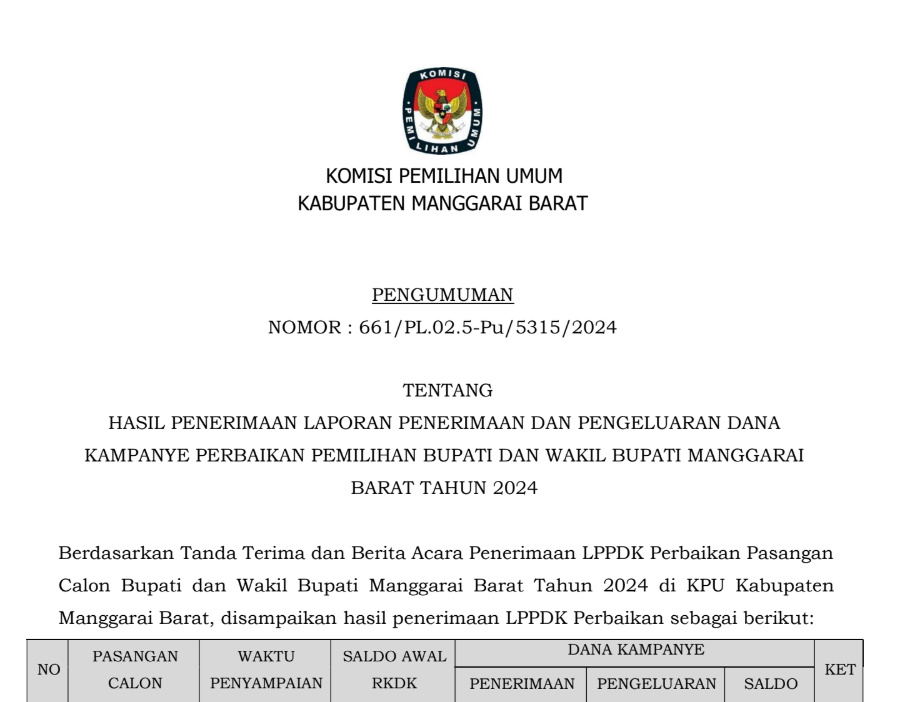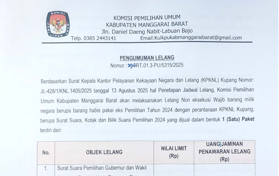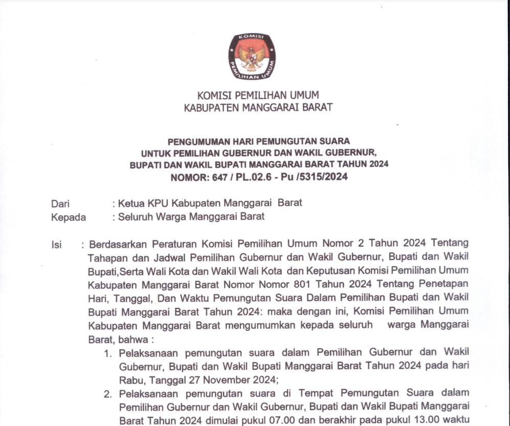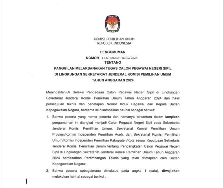 Sekretariat Jenderal Komisi Pemilihan Umum (KPU) Republik Indonesia resmi mengumumkan panggilan pelaksanaan tugas bagi Calon Pegawai Negeri Sipil (CPNS) Formasi Tahun Anggaran 2024 yang telah dinyatakan lulus seleksi dan ditempatkan di lingkungan KPU Kabupaten Manggarai Barat. Sebanyak enam orang CPNS dipanggil untuk segera melaksanakan kewajiban lapor diri sebagai bagian dari tahapan awal penugasan di instansi tujuan. Berdasarkan surat resmi dari Sekretariat Jenderal KPU, para CPNS diwajibkan melapor diri pada: Tanggal: Senin, 2 Juni 2025 Tempat: Kantor KPU Provinsi Nusa Tenggara Timur (NTT) Kewajiban ini merupakan langkah penting sebelum para CPNS tersebut menjalani masa percobaan dan orientasi kerja di lingkungan KPU Kabupaten Manggarai Barat. Setelah proses pelaporan, mereka akan langsung diarahkan ke unit kerja masing-masing untuk memulai pelaksanaan tugas sebagai abdi negara. Pihak KPU mengingatkan agar seluruh CPNS yang bersangkutan hadir tepat waktu dan membawa dokumen yang telah ditentukan sesuai ketentuan yang berlaku. Keterlambatan atau ketidakhadiran tanpa alasan yang sah dapat berdampak pada proses administrasi kepegawaian. Lebih Lengkapnya KLIK DISISNI