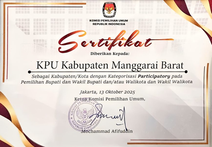 Penghargaan ini diberikan sebagai bentuk apresiasi atas kerja keras dan inovasi KPU Manggarai Barat dalam meningkatkan partisipasi pemilih serta mendorong keterlibatan aktif masyarakat dalam setiap pemilihan kepala daerah. Sertifikat penghargaan tersebut diserahkan langsung oleh perwakilan KPU RI dalam sebuah acara resmi yang dihadiri oleh seluruh jajaran KPU dari berbagai daerah di Indonesia.