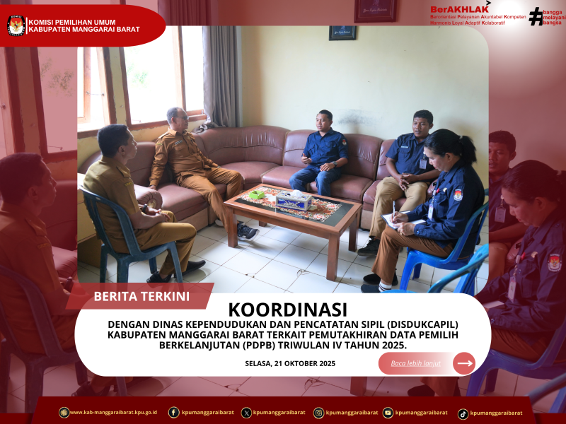 LabuanBajo,manggaraibarat.kpu.go.id –Komisi Pemilihan Umum Kabupaten Manggarai Barat melaksanakan koordinasi dengan Dinas Kependudukan dan Pencatatan Sipil (Disdukcapil) Kabupaten Manggarai Barat terkait Pemutakhiran Data Pemilih Berkelanjutan (PDPB) Triwulan IV Tahun 2025, di kantor Disdukcapil Mannggarai Barat pada Selasa, 21 Oktober 2025.