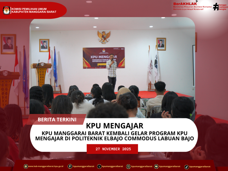 Labuan Bajo, manggaraibarat.kpu.go.id - Komisi Pemilihan Umum Kabupaten Manggarai Barat kembali menggelar program KPU Mengajar yang berlangsung di Politeknik eLBajo Commodus Labuan Bajo pada Kamis, 27 November 2025 pukul 15.00 WITA. Kegiatan ini merupakan bagian dari upaya KPU untuk memberikan pendidikan pemilih serta menanamkan pemahaman yang komprehensif mengenai penyelenggaraan pemilu, khususnya bagi pemilih pemula di lingkungan perguruan tinggi, sehingga mampu melahirkan pemilih yang cerdas, partisipatif, dan sadar akan hak pilihnya.
