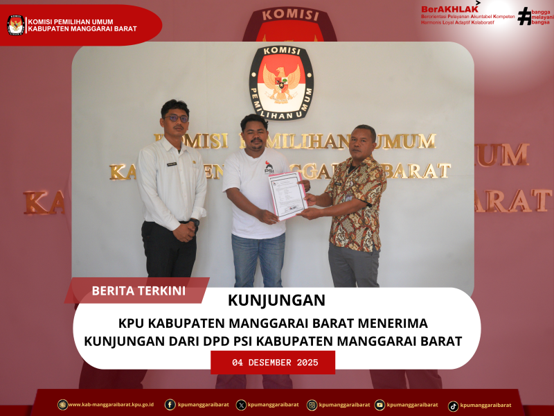 Labuan Bajo, manggaraibarat.kpu.go.id - Komisi Pemilihan Umum Kabupaten Manggarai Barat menerima kunjungan Penghubung Dewan Pimpinan Daerah (DPD) Partai Solidaritas Indonesia (PSI) Kabupaten Manggarai Barat pada Kamis, 4 Desember 2025, bertempat di Kantor KPU Kabupaten Manggarai Barat.