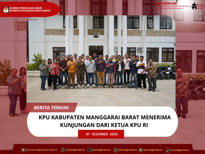 Labuan Bajo, manggaraibarat.kpu.go.id - Komisi Pemilihan Umum Kabupaten Manggarai Barat menerima kunjungan supervisi Ketua KPU Republik Indonesia, Mochammad Afifuddin, beserta rombongan pada Minggu, 7 Desember 2025, bertempat di Kantor KPU Kabupaten Manggarai Barat.