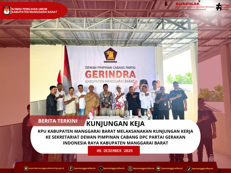 Labuan Bajo, manggaraibarat.kpu.go.id - Komisi Pemilihan Umum Kabupaten Manggarai Barat melaksanakan kunjungan kerja ke Sekretariat Dewan Pimpinan Cabang (DPC) Partai Gerakan Indonesia Raya (Gerindra) Kabupaten Manggarai Barat pada Senin, 8 Desember 2025. Kunjungan tersebut dilakukan dalam rangka Pemutakhiran Data Partai Politik Sementara II Tahun 2025 sekaligus sosialisasi Peraturan Komisi Pemilihan Umum (PKPU) Nomor 3 Tahun 2025.