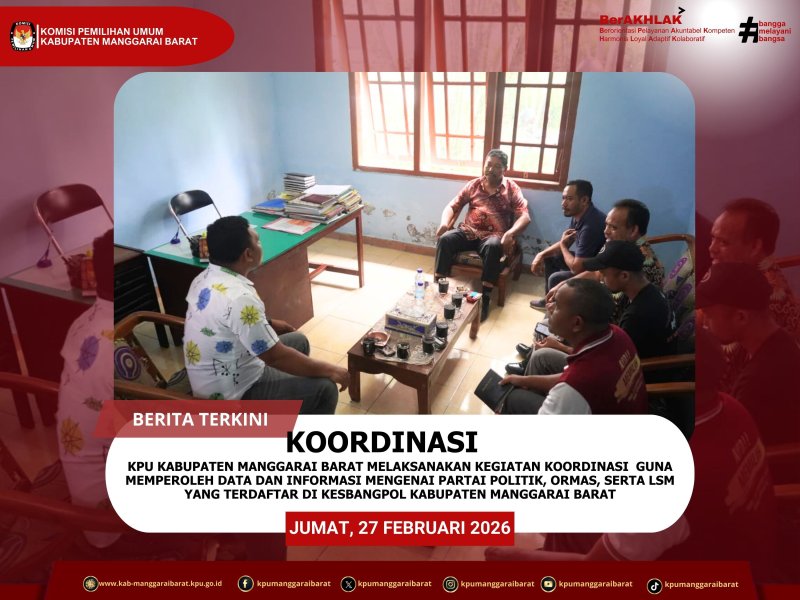 Kegiatan tersebut dilaksanakan pada Jumat, 27 Februari 2026, bertempat di Kantor Kesbangpol Kabupaten Manggarai Barat. Koordinasi ini bertujuan untuk memastikan ketersediaan data yang akurat dan mutakhir sebagai dasar pelibatan para pemangku kepentingan dalam agenda kelembagaan KPU.