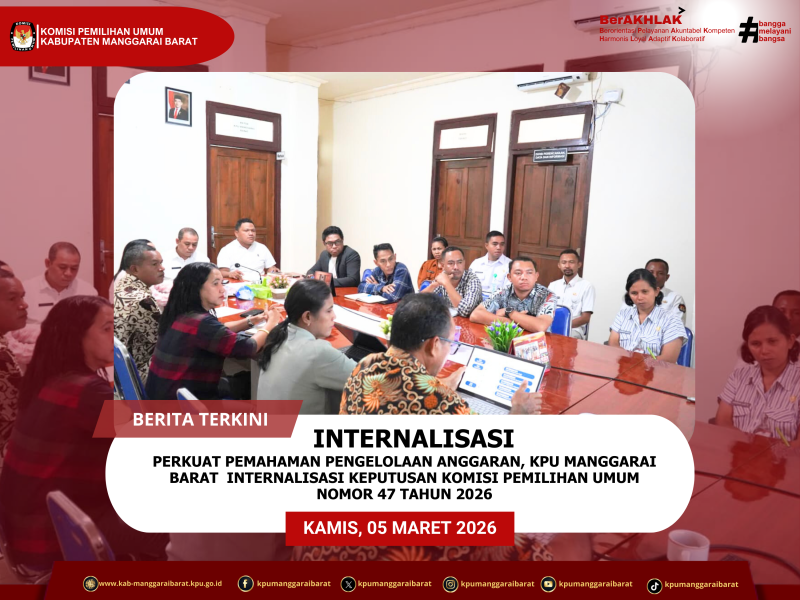Labuan Bajo, manggaraibarat.kpu.go.id - KPU Kabupaten Manggarai Barat melaksanakan rapat internalisasi Keputusan Komisi Pemilihan Umum Nomor 47 Tahun 2026 tentang Petunjuk Teknis Pelaksanaan Program dan Kegiatan Daftar Isian Pelaksanaan Anggaran KPU Provinsi dan KPU Kabupaten/Kota Bagian Anggaran 076 Tahun 2026. Kegiatan ini berlangsung pada Kamis (05/03) di ruang rapat lantai 1 Kantor KPU Kabupaten Manggarai Barat.