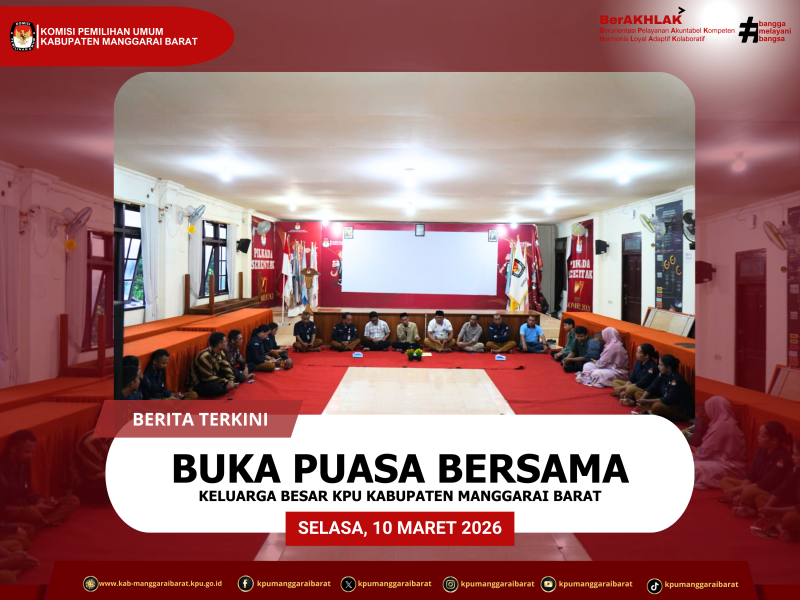 LabuanBajo,manggaraibarat.kpu.go.id – Keluarga besar KPU Kabupaten Manggarai Barat menggelar kegiatan buka puasa bersama pada Selasa, 10 Maret 2026, pukul 17.00 WITA. Kegiatan yang berlangsung di Aula Lantai 2 Kantor KPU Manggarai Barat ini menjadi momentum kebersamaan dalam menyemarakkan bulan suci Ramadan 1447 Hijriah.