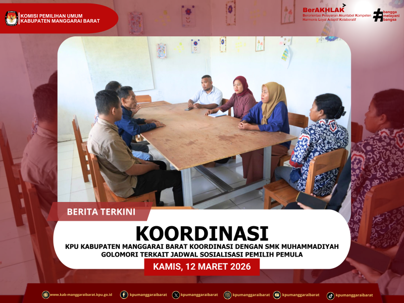 LabuanBajo,manggaraibarat.kpu.go.id – Komisi Pemilihan Umum (KPU) Kabupaten Manggarai Barat pada Kamis, 12 Maret 2026 melaksanakan koordinasi dengan pihak SMK Muhammadiyah Golo Mori terkait rencana pelaksanaan Pendidikan Pemilih program “KPU Mangajar”. Sosialisasi ini direncanakan akan diberikan kepada para siswa-siswi SMK Muhammadiyah Golo Mori Labuan Bajo sebagai bagian dari upaya meningkatan pemahaman pendidikan pemilih sejak dini.