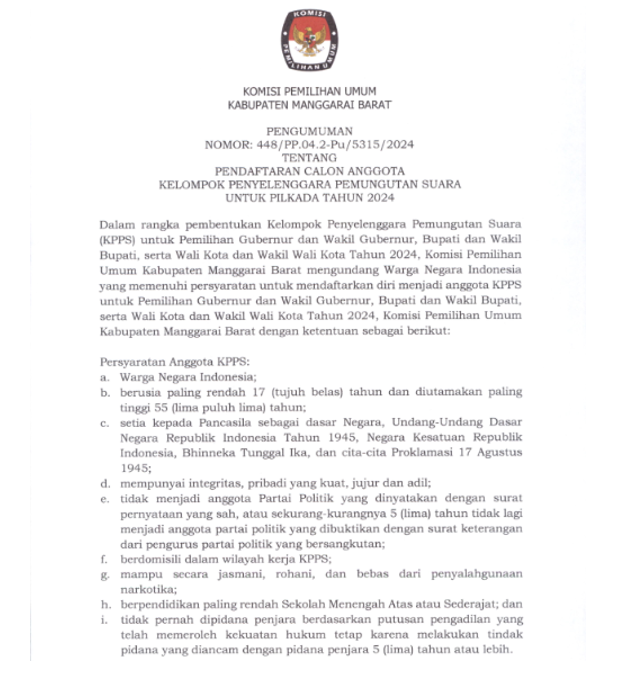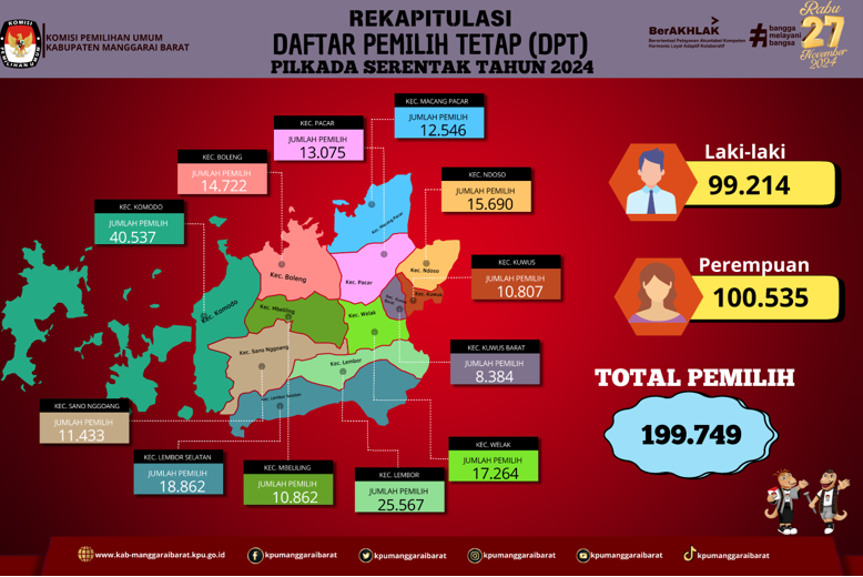 Labuan Bajo, manggaraibarat.kpu.go.id - Komisi Pemilihan Umum (KPU) Kabupaten Manggarai Barat menetapkan Daftar Pemilih Tetap (DPT) dalam Pemilihan Gubernur dan Wakil Gubernur, Bupati dan wakil Bupati serta Walikota dan Wakil Walikota sejumlah 199. 749 pemilih, dengan Jumlah pemilih laki-laki sebanyak 99.214 orang dan Pemilih Perempuan sebanyak 100.535 yang menyebar di 587 TPS di 169 Desa/Kelurahan dan 12 Kecamatan se-Kabupaten Manggarai Barat. Jumlah pemilih dalam DPT ini di lakukan secara transparan melalui kegiatan Rapat Pleno Terbuka Rekapitulasi Daftar Pemilih Sementara Hasil Perbaikan dan Penetapan Jumlah Daftar Pemilih Tetap Untuk Pemilihan Gubernur dan Wakil Gubernur, Bupati dan Wakil Bupati serta Walikota dan Wakil Walikota Tahun 2024, pada Jumat (20/09/2024) di Hotel Zasgo Labuan Bajo. Ketua KPU Kabupaten Manggarai Barat, Ferdiano Sutarto Parman, dalam sambutan pembukaan menyampaikan bahwa sebelum di tetapkan menjadi DPT terlebih dahulu KPU sudah memberikan kesempatan kepada masyarakat dan rekan-rekan penyelenggara untuk memberikan masukan dan tanggapan terkait Daftar Pemilih Sementara (DPS) "Bapak Ibu sekalian, Sebelum DPS ini ditetapkan menjadi DPT, KPU sudah membuka ruang selama sepuluh hari kepada publik melalui penyelenggara tingkat desa untuk memberikan tanggapan terhadap DPS agar kiranya DPS yang disampaikan kepada masyarakat dapat kita tetapkan menjadi DPT pada hari ini sehingga kemudian data yang ditetapkan benar-benar data yang mutlak sehingga kemudian hak pilih masyarakat dapat di akomodir." Ungkap Parman. Lebih lanjut, Parman mengungkapkan bahwa masukan dan tanggapan masyarakat dan juga Bawaslu Manggarai Barat sudah di tindak lanjuti oleh KPU kabupaten Manggarai Barat. "Masukan dan tanggapan dari masyarakat dan BAWASLU sudah kami tindak lanjuti.". Tutup Parman. Sementara itu, Ketua Divisi Perencanaan Data dan Informasi, Agustinus Emil Rahmat didampingi Anggota dan Sekretaris KPU Manggarai Barat memimpin berjalannya kegiatan pembacaan hasil rekapitulasi DPSHP tingkat kecamatan oleh Panitia Pemilihan Kecamatan (PPK) se-kabupaten Manggarai Barat. Berikut Ini rincian jumlah Daftar Pemilih Tetap di 12 Kecamatan yang ada di Kabupaten Manggarai Barat: Kecamatan Pacar : 13.075, Lembor Selatan: 18.862, Sano Nggoang : 11.4334. Kuwus : 10.807 Mbeliling : 10.862 Boleng : 14.722 Kuwus Barat :8.384 Lembor : 25.567 Welak : 17.264 Macang Pacar :12.546. Ndoso : 15.690 Komodo : 40.537.