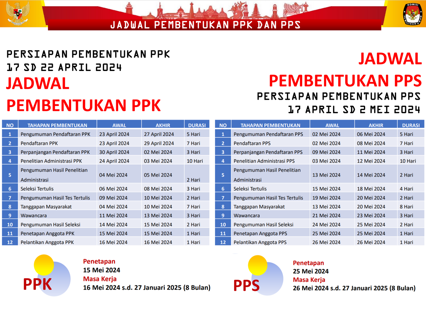 Labuan Bajo, manggaraibarat.kpu.go.id – Komisi Pemilihan Umum Kabupaten Manggarai Barat akan kembali merekrut Anggota Panitia Pemilihan Kecamatan (PPK). Perihal ini tertuang dalam Keputusan Komisi Pemilihan Umum Nomor 475 Tahun 20242024 Tentang Perubahan Keempat Atas Keputusan Komisi Pemilihan Umum Nomor 476 Tahun 2022 Tentang Pedoman Teknis Pembentukan Badan Adhoc Penyelenggara Pemilihan Umum Dan Pemilihan Gubernur Dan Wakil Gubernur, Bupati Dan Wakil Bupati, Dan Walikota Dan Wakil Walikota. Menindaklanjuti ketentuan di atas, Komisi Pemilihan Umum Kabupaten Manggarai Barat akan kembali merekrut sejumlah 60 Anggota Panitia Pemilihan Kecamatan yang selanjutnya akan menjadi penyelenggara Pilkada di Kecamatan di 12 Kecamatan se-Kabupaten Manggarai Barat. Mekanisme dan metode perektrutan dilaksanakan secara terbuka atau terbuka untuk umum, sebagaimana ketentuan Keputusan Komisi Pemilihan Umum Nomor 476 Tahun 2024 Tentang Metode Pembentukan Panitia Pemilihan Kecamatan Dan Panitia Pemungutan Suara Dalam Penyelenggaraan Pemilihan Gubernur Dan Wakil Gubernur, Bupati Dan Wakil Bupati, Serta Walikota Dan Wakil Walikota Tahun 2024. Berdasarkan ketentuan di atas, jadwal pelaksanaan pembentukan PPK akan melalui 12 tahapan kegiatan, yang yang diawali dengan pengumuman pendaftaran sekaligus penerimaan pendaftaran calon anggota pada 23 April 2024, dan akan berakhir pada tahapan kegiatan penetapan dan pelantikan calon terpilih pada 16 Mei 2024. Dalam rangka pembentukan tersebut, calon anggota PPK tetap mengikuti persyaratan sebagaimana ketentuan yang berlaku dalam Pasal 35 Peraturan Komisi Pemilihan Umum Nomor 8 Tahun 2022 tentang Pembentukan dan Tata Kerja Badan Adhoc Penyelenggara Pemilihan Umum dan Pemilihan Gubernur dan Wakil Gubernur, Bupati dan Wakil Bupati, dan Walikota dan Wakil Walikota, yakni warga negara Indonesia; berusia paling rendah 17 (tujuh belas) tahun; setia kepada Pancasila sebagai dasar Negara, Undang-Undang Dasar Negara Republik Indonesia Tahun 1945, Negara Kesatuan Republik Indonesia, Bhinneka Tunggal Ika dan cita-cita Proklamasi 17 Agustus 1945; mempunyai integritas, pribadi yang kuat, jujur dan adil; tidak menjadi anggota partai politik yang dinyatakan dengan surat pernyataan yang sah atau sekurangkurangnya dalam waktu 5 (lima) tahun tidak lagi menjadi anggota partai politik yang dibuktikan dengan surat keterangan dari pengurus partai politik yang bersangkutan; berdomisili dalam wilayah kerja PPK mampu secara jasmani, rohani dan bebas dari penyalahgunaan narkotika; berpendidikan paling rendah sekolah menengah atas atau sederajat; dan tidak pernah dipidana penjara berdasarkan putusan pengadilan yang telah memperoleh kekuatan hukum tetap karena melakukan tindak pidana yang diancam dengan pidana penjara 5 (lima) tahun atau lebih (humaskpumanggaraibarat)