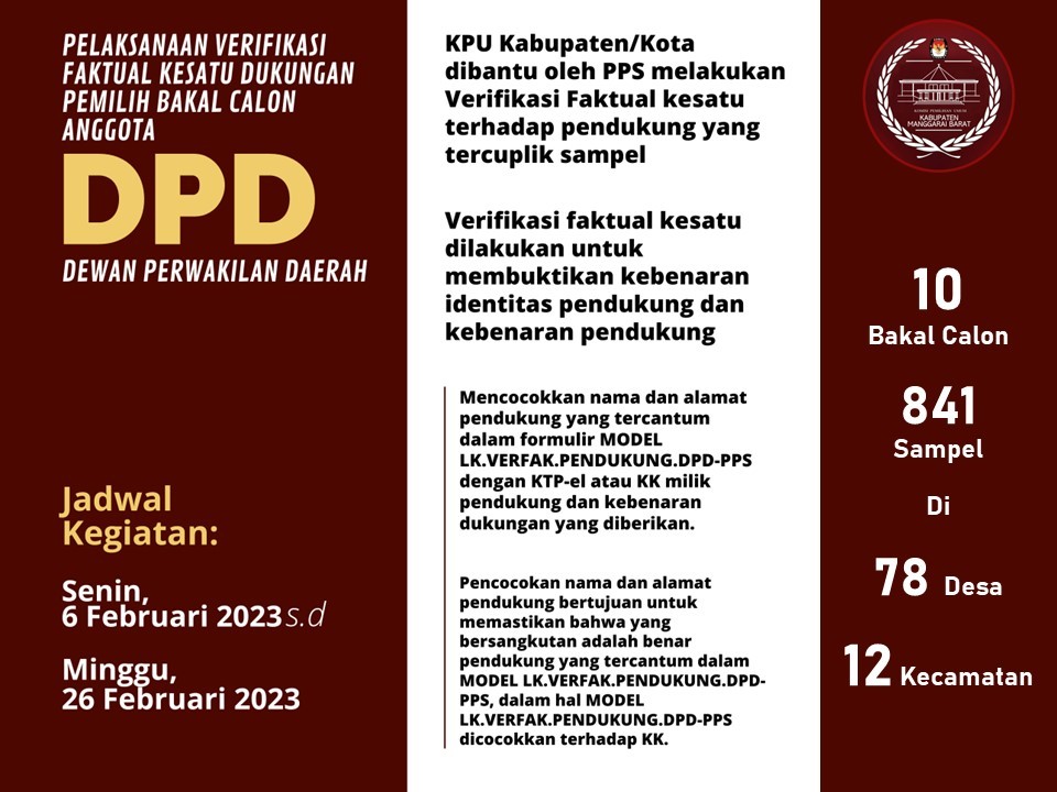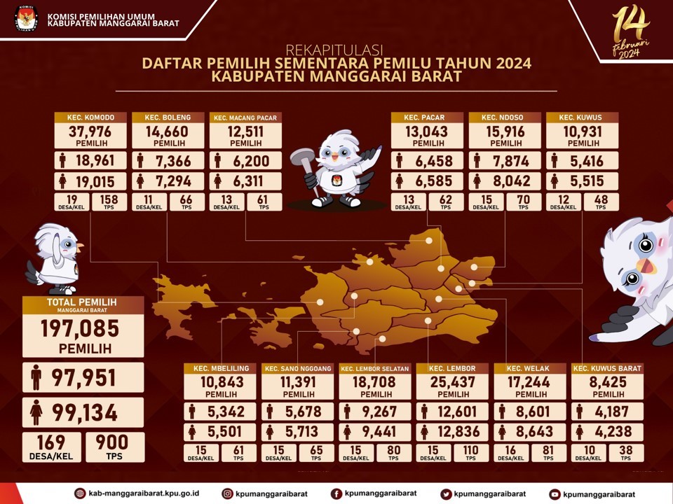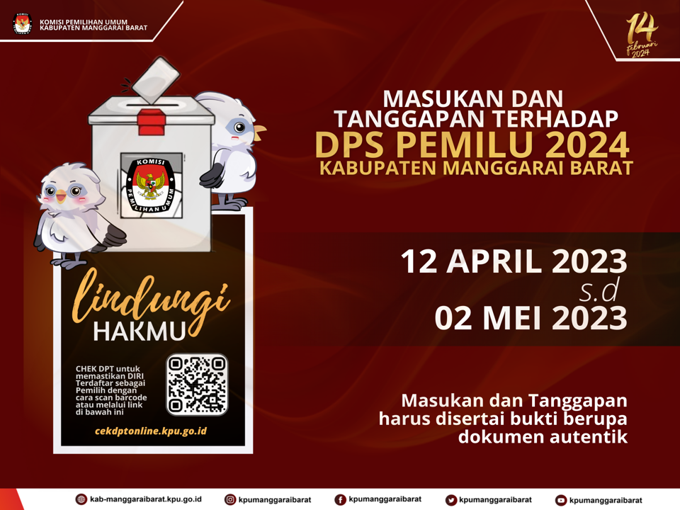 Labuan Bajo, manggaraibarat.kpu.go.id – Berdasarkan Peraturan Komisi Pemilihan Umum Nomor 7 Tahun 2023 tentang perubahan atas Peraturan Komisi Pemilihan Umum Nomor 2 Tahun 2022 tentang Penyusunan Daftar Pemilih Dalam Penyelenggaraan Pemilihan Umum dan Sistem Informasi Data Pemilih, serta Keputusan Komisi Pemilihan Umum Nomor 27 Tahun 2023 tentang Pedoman Teknis Penyusunan Daftar Pemilih Dalam Negeri pada Penyelenggaraan Pemilihan Umum untuk mengumumkan DPS oleh PPS dan disampaikan oleh PPK dan KPU Kabupaten/Kota kepada para pihak termasuk peserta pemilu dan Bawaslu dan jajarannya untuk kemudian mendapat masukan dan tanggapan. Jadwal dan Tahapan Pengumuman DPS oleh PPS dilaksanakan pada 12 April 2023 s.d 25 April 2023 Penyampaian DPS kepada Peserta Pemilu di tingkat Kecamatan oleh PPS Melalui PPK dilaksanakan pada 12 April 2023 s.d 2 Mei 2023 Masukan dan Tanggapan terhadap DPS dimulai pada 12 April 2023 s.d 2 Mei 2023 Daftar Pemilih Sementara (DPS) Daftar Pemilih Sementara sebagaimana dimaksud dapat dilihat secara langsung di papan pengumuman ditempelkan di tempat strategis di wilayah desa dan kelurahan masing-masing. Atau dapat diunduh DI SINI. Cek DPT Dan untuk memastikan apakah nama Anda terdaftar sebagai pemilih dapat dicek secara mandiri melalui link CEK DPT ONLINE Mekanisme Penyampaian Tanggapan dan Masukan Masukan dan tanggapan terkait Pemilih TMS, Pemilih Baru, Pemilih Ubah Data, dan Pemilih Ganda dapat disampaikan kepada KPU melalui PPS atau PPK disertai dengan bukti berupa dokumen autentik sesuai format yang disediakan. Format dapat diunduh DI SINI. (humas kpu kb/foto:reka/ed kb)
