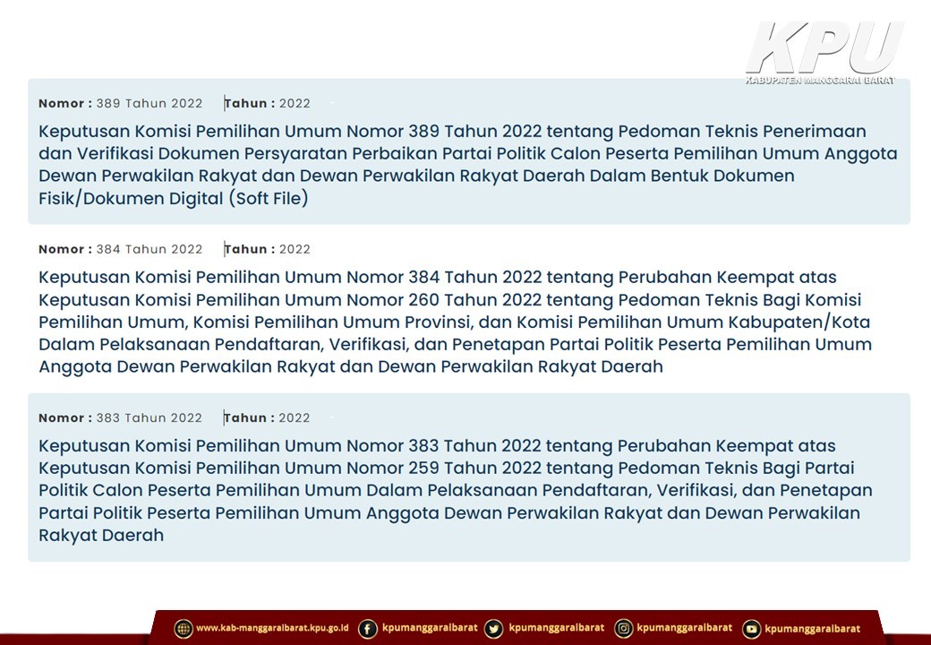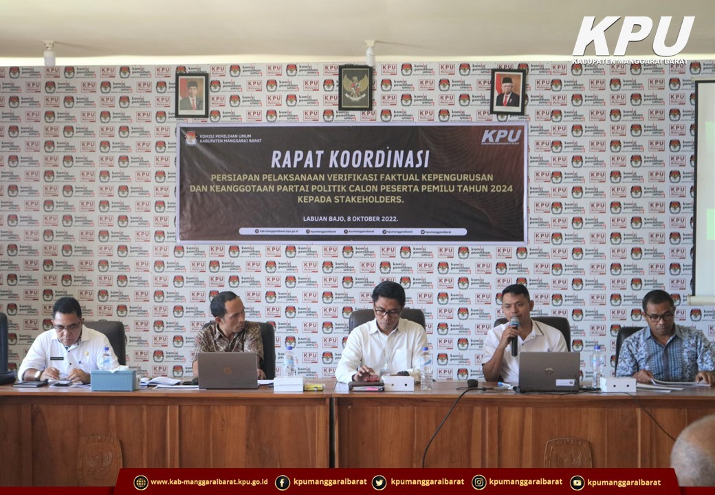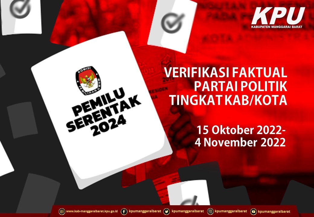 Labuan Bajo, manggaraibarat.kpu.go.id – Berdasarkan Rincian Jadwal dan Kegiatan tahapan verifikasi faktual sebagaimana terlampir dalam Keputusan Komisi Pemilihan Umum Nomor 384 Tahun 2022 tentang Perubahan Keempat atas Keputusan Komisi Pemilihan Umum Nomor 260 Tahun 2022 tentang Pedoman Teknis Bagi Komisi Pemilihan Umum, Komisi Pemilihan Umum Provinsi, dan Komisi Pemilihan Umum Kabupaten/Kota Dalam Pelaksanaan Pendaftaran, Verifikasi, dan Penetapan Partai Politik Peserta Pemilihan Umum Anggota Dewan Perwakilan Rakyat dan Dewan Perwakilan Rakyat Daerah bahwa Verifikasi Faktual kepengurusan dan keanggotaan Partai Politik tingkat kabupaten/kota oleh KPU Kabupaten/Kota dilaksanakan pada Sabtu,15 Oktober 2022 sampai dengan Jumat,04 November 2022. Namun demikian, menindaklanjuti ketentuan Keputusan tersebut di atas, KPU RI kemudian menerbitkan Surat Edaran nomor 839/PL.01.1-SD/05/2022 perihal Verifikasi Faktual Partai Politik Calon Peserta Pemilu Tahun 2022 tertanggal 14 Oktober 2022 yang menyebutkan bahwa KPU kabupaten/Kota melaksanakan Verifikasi Faktual Kepengurusan Tingkat Kabupaten/Kota pada tanggal 16 Oktober 2022 sampai dengan 4 November 2022. Krispianus Bheda, Humas KPU Kabupaten Manggarai Barat menjelaskan bahwa dalam rentang waktu tersebut, pelaksanaan kegiatan verifikasi faktual kepengurusan dan keanggotaan akan dilaksanakan secara bersamaan yakni dimulai pada 16 Oktober 2022. “Namun, kami menunggu sampel keanggotaan yang diturunkan KPU RI melalui sipol, sambil juga menyiapkan hal-hal teknis lainnya misalnya terkait penguatan tim kerja internal melalui internalisasi dan simulasi” jelasnya. Perihal data Partai Politik Calon Peserta Pemilu di tingkat Kabupaten Manggarai Barat yang akan diverifikasi faktual, menurut Kris, sudah ada. "yakni ada delapan partai politik tingkat kabupaten Manggarai Barat yang selanjutnya akan diverifikasi faktual" akunya. Kedelapan calon peserta pemilu tersebut adalah Partai Persatuan Indonesia, Partai Bulan Bintang, Partai Kebangkitan Nusantara, Partai Garda Perubahan Indonesia, Partai Hati Nurani Rakyat, Partai Solidaritas Indonesia, Partai Buruh dan Partai Ummat. Dan perihal itu sudah menyampaikan pemberitahuan baik ke Partai Politik calon peserta pemilu maupun ke Bawaslu. (Humas KPU Kabupaten Manggarai Barat) Catatan: 1. Sebelumnya melalui pengumuman bernomor 9/PL.01.1-Pu/05/2022 tertanggal 14 Oktober 2022, KPU RI telah menerbitkan tentang Pengumuman Hasil Verifikasi Administrasi. UNDUH DI SINI 2. Perkembangan Pendaftaran Parpol dan Verifikasi Administrasi Parpol Calon Peserta Pemilu 2024 sampai dengan tanggal 14 Oktober 2022. UNDUH DI SINI