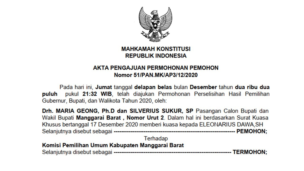 HUMAS MC KPUMABAR – Komisi Pemilihan Umum Kabupaten Manggarai Barat siap menghadapi Sengketa Perselisihan Hasil Pemilihan di Mahkamah Konstitusi yang diajukan oleh pasangan calon Bupati dan Wakil Bupati Manggarai Barat yang keberatan atas Keputusan Komisi Pemilihan Umum Kabupaten Manggarai Barat Nomor:127/PL.02.6-Kpt/5315/KPU-Kab/XII/2020 Tentang Rekapitulasi Hasil Penghitungan Suara Pemilihan Bupati Dan Wakil Bupati Kabupaten Manggarai Barat Tahun 2020 tertanggal 16 Desember 2020. Seperti diketahui, berdasarkan pantauan Humas Media Centre KPU Kabupaten Manggarai Barat di laman resmi Mahkamah Konstitusi Republik Indonesia, dari 114 Kabupaten yang mengajukan permohonan sengketa perselisihan hasil pemilihan di Mahkamah Konstitusi, Kabupaten Manggarai Barat adalah salah satunya. Permohonan Perselisihan Hasil Pemilihan Di Mahkamah Konstitusi diajukan oleh Pasangan Calon Bupati dan Wakil Bupati Manggarai Barat nomor urut 2 (dua) atas nama Drh. Maria Geong, Ph.D dan Silverius Sukur, SP melalui Kuasa Pemohon Eleonarius Dawa,SH dari Dictum Jurist Law Office pada Jumat, 18 Desember 2020 21:32:22 WIB. Dasar Gugatan Pasangan Calon Drh. Maria Geong, Ph.D dan Silverius Sukur, SP Pasangan Calon Bupati dan Wakil Bupati Manggarai Barat nomor urut 2 (dua) atas nama Drh. Maria Geong, Ph.D dan Silverius Sukur, SP sebagai Pemohon mengjaukan permohonan ke Mahkamah Konstitusi untuk membatalkan Keputusan Komisi Pemilihan Umum Kabupaten Manggarai Barat Nomor:127/PL.02.6-Kpt/5315/KPU-Kab/XII/2020 Tentang Rekapitulasi Hasil Penghitungan Suara Pemilihan Bupati Dan Wakil Bupati Kabupaten Manggarai Barat Tahun 2020 tertanggal 16 Desember 2020. Adapun yang menjadi dasar dan pertimbangan dari pengajuan Perselisihan hasil yang dimohonkan adalah karena adanya dugaan pelanggaran yang dilakukan secara sistematis, terstruktur dan massif yang dilakukan oleh Komisi Pemilihan Umum Kabupaten Manggarai Barat. Menurut Pemohon, bahwa pelanggaran-pelanggaran yang ditemukan telah dipersiapkan secara terencana sejak awal mulai dari proses pembuatan Daftar Pemilih Tetap, proses kampanye dan masa tenang, saat pencoblosan hingga proses rekapitulasi penghitungan suara di tingkat Kecamatan yang secara rinci diuraikan dalam kurang lebih 50-an dalil. Tanggapan Komisi Pemilihan Umum Kabupaten Manggarai Barat Komisi Pemilihan Umum Kabupaten Manggarai Barat mengapresiasi Langkah hukum yang ditempuh Pasangan Calon Bupati dan Wakil Bupati Manggarai Barat nomor urut 2 (dua) atas nama Drh. Maria Geong, Ph.D dan Silverius Sukur, SP. Perihal itu disampaikan oleh Ponsianus Mato, SH, Ketua Divisi Hukum Komisi Pemilihan Umum Kabupaten Manggarai Barat. Menurutnya, upaya hukum adalah hak setiap orang baik secara sendiri-sendiri maupun kelompok. Dan bahkan, lanjutnya, KPU sendiri dalam Menyusun regulasi terkait tahapan, program dan jadwal penyelenggaraan pemilihan tahun 2020 sudah menyiapkan tahapan untuk itu, yakni tahapan Penyelesaian Pelanggaran Dan Sengketa Hasil Pemilihan. “Jadi sebelum dimohonkan oleh pasangan calon dan atau siapa pun, secara institusional sebenarnya kita sudah siap sejak awal” akunya. Mato menambahkan, selain karena secara normatif dmungkinkan, KPU Kabupaten Manggarai Barat berkeyakinan bahwa akan menghadapi dengan mudah, karena Komisi Pemilihan Umum Kabupaten Manggarai Barat telah melaksanakan tahapan pemilihan secara baik dan benar berdasarkan peraturan perundang-undangan yang berlaku mulai dari awal pemutakhiran data pemilih dan sosialiasi sampai dengan pemungutan suara dan rekapitulasi hasil. “Bahkan pelaksanaan tahapan pemilihan yang dilakukan oleh Komisi Pemilihan Umum Kabupaten Manggarai Barat dilaksanakan secara transparan dan tidak ditutup-tutupi” jelasnya. Ringkasnya, lanjut Mato, KPU Kabupaten Manggarai Barat siap menghadapinya, “karena sekali lagi, upaya hukum adalah hak dari para kontestan pemilihan tetapi pada prinsipnya siapa yang mendalilkan harus dapat membuktikan dalilnya” tutupnya. Penulis/Editor: Humas Media Centre KPU Manggarai Barat