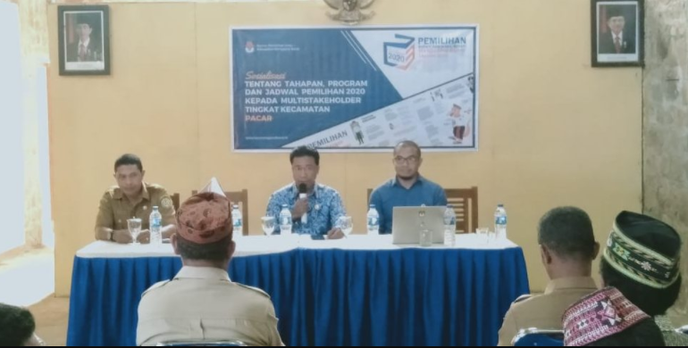 Dalam pelaksanaan sosialisasi ini, nara sumber utama adalah Heribertus Panis, Komisioner Komisi Pemilihan Umum Kabupaten Manggarai Barat sekaligus Koordinator Wilayah untuk Kecamatan Pacar dan Macang Pacar. Hadir dalam pelaksanaan sosialisasi ini adalah para pemangku kepentingan tingkat kecamatan Pacar yakni Kepala Desa, BPD, Kaur Perencanaan Desa dan Operator Seskeudes dari 13 Desa Se-Kecamatan Pacar.