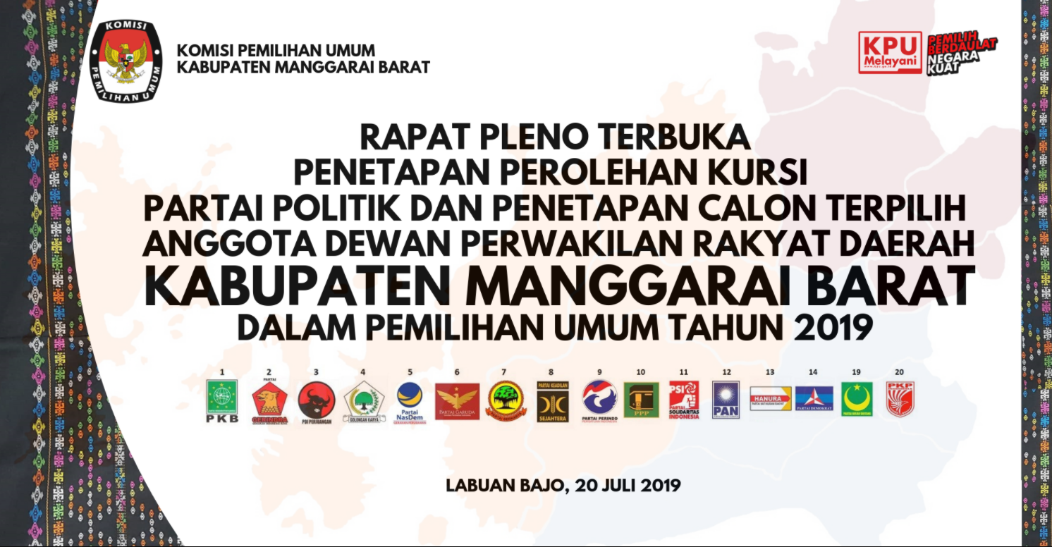 LBJ-KPUMabar.id, Komisi Pemilihan Umum Kabupaten Manggarai Barat akhirnya menjadwalkan kegiatan Rapat Pleno Terbuka Penetapan Perolehan Kursi Partai Politik dan Calon Terpilih Anggota Dewan Perwakilan Rakyat Daerah Kabupaten Manggarai Barat (periode 2019-2024) dalam pemilihan umum tahun 2019. Rapat Pleno Terbuka yang menghadirkan partai politik peserta pemilu dan para pemangku kepentingan tersebut sedianya akan digelar pada Sabtu, 20 Juli 2019, pukul 09.00 Wita di Jayakarta Hotel Labuan Bajo. Agenda penetapan ini dapat dilaksanakan karena berdasarkan ketentuan Peraturan Komisi Pemilihan Umum No. 14 Tahun 2019 tentang perubahan Kelima atas Peraturan Komisi Pemilihan Umum No. 7 Tahun 2017 tentang Tahapan, Program dan Jadwal Penyelenggaran Pemilihan Umum Tahun 2019 yang menegaskan bahwa penetapan perolehan kursi dan penetapan calon terpilih tanpa permohonan peselisihan hasil pemilihan umum paling lama 5 (lima) hari setelah diterbitkannya surat KPU RI yang menjelaskan bahwa KPU RI telah menerima surat Panitera Mahkamah Konstitusi mengenai daftar daerah yang terdapat dalam Permohonan Perselisihan Hasil Pemilu. Dalam Surat Edaran KPU RI tertanggal 17 Juli 2019 tersebut, Daerah Pemilihan Umum Kabupaten Manggarai Barat tidak menjadi lokus sengketa pemilu legislatif DPRD Kabupaten/Kota yang diajukan oleh Partai Politik selaku pemohon. Karenanya rapat pleno penetapan perolehan kursi dan penetapan calon terpilih dapat dijadwalkan. (kbs/kpu) Lihat data lengkapnya di sini: HASIL PEROLEHAN KURSI PARTAI POLITIK DAN CALON TERPILIH ANGGOTA DEWAN PERWAKILAN RAKYAT DAERAH KABUPATEN MANGGARAI BARAT DALAM PEMILIHAN UMUM TAHUN 2019