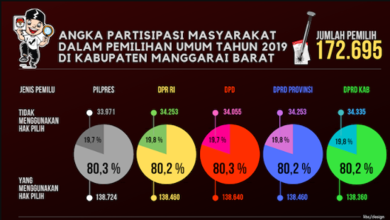 Tingkat partisipasi pemilih di Kabupaten Manggarai Barat, Provinsi Nusa Tenggara Timur dalam Pemilihan Umum Tahun 2019 tercatat mencapai angka di atas 80 persen, sebuah capaian yang melampaui target yang ditetapkan secara nasional. Untuk lima jenis pemilihan umum, yakni presiden dan wkail presiden, DPR RI, DPD, DPRD Provinsi dan DPRD Kabupaten, partisipasinya hampir sama. Dari total 172.695 pemilih, pengguna hak pilih dalam pemilu presiden dan wakil presiden sebanyak 138,724 pemilih, DPR RI sebanyak 138.460 pemilih, DPD sebanyak 138.640 pemilih, DPRD Provinsi sebanyak 138.453 pemilih dan DPRD Kabupaten sebanyak 138.360 pemilih. Krispianus Bheda, Komisioner Komisi Pemilihan Umum Kabupaten Manggarai Barat yang membidangi Divisi Partisipasi Masyarakat dan Pendidikan Pemilih menjelaskan, ini merupakan sebuah tren positif, karena terjadi peningkatan dibandingkan dengan partisipasi pada Pemilu Gubernur dan Wakil Gubernur tahun 2018 yang mencapai 69 persen atau terjadi peningkatan 11 persen. Dari total 157.652 pemilih kala itu, jelas dia, yang menggunakan hak pilih sebanyak 108.141 pemilih, sementara yang tidak menggunakan hak pilih sejumlah 49.511 pemilih. “Ada peningkatan prosentasi pemilih untuk datang ke TPS. Kita harapkan data kuantitas ini dapat berbanding lurus dengan peningkatan kualitas demokrasi,” jelasnya. Kris menambahkan, tingkat partisipasi masyarakat ini melampaui target yang ditetapkan secara nasional yakni 77,5 persen. “Kita layak menyampaikan apresiasi kepada semua pihak, penyelenggara pemilu, peserta pemilu, pemerintah, dan masyarakat luas yang telah bahu membahu menyukseskan pemilu 2019 di Kabupaten Manggarai Barat. Ini adalah karena kerja bersama,” katanya.