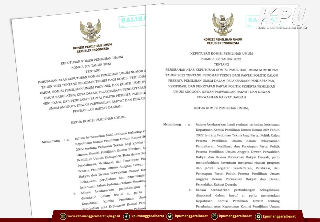 Labuan Bajo, manggaraibarat.kpu.go.id - Jadwal kegiatan pendaftaran, verifikasi, dan penetapan Partai Politik peserta Pemilu anggota DPR dan DPRD, khususnya terkait Verifikasi Administrasi dokumen persyaratan keanggotaan Partai Politik di tingkat Kabupaten/Kota diperpanjang sampai dengan Jumat, 9 September 2022. Perpanjangan jadwal tersebut tertuang itu tertuang dalam lampiran Keputusan Komisi Pemilihan Umum Nomor 330 Tahun 2022 tentang Perubahan Kedua atas Keputusan Komisi Pemilihan Umum Nomor 259 Tahun 2022 tentang Pedoman Teknis Bagi Partai Politik Calon Peserta Pemilihan Umum Dalam Pelaksanaan Pendaftaran, Verifikasi, dan Penetapan Partai Politik Peserta Pemilihan Umum Anggota Dewan Perwakilan Rakyat dan Dewan Perwakilan Rakyat Daerah, dan lampiran Keputusan Komisi Pemilihan Umum Nomor 331 Tahun 2022 tentang Perubahan Kedua atas Keputusan Komisi Pemilihan Umum Nomor 260 Tahun 2022 tentang Pedoman Teknis Bagi Komisi Pemilihan Umum, Komisi Pemilihan Umum Provinsi, dan Komisi Pemilihan Umum Kabupaten/Kota Dalam Pelaksanaan Pendaftaran, Verifikasi, dan Penetapan Partai Politik Peserta Pemilihan Umum Anggota Dewan Perwakilan Rakyat dan Dewan Perwakilan Rakyat Daerah.