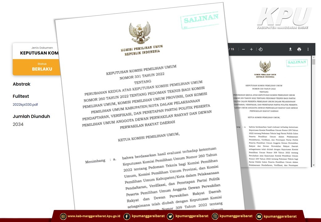 Keputusan Komisi Pemilihan Umum Nomor 331 Tahun 2022 tentang Perubahan Kedua atas Keputusan Komisi Pemilihan Umum Nomor 260 Tahun 2022 tentang Pedoman Teknis Bagi Komisi Pemilihan Umum, Komisi Pemilihan Umum Provinsi, dan Komisi Pemilihan Umum Kabupaten/Kota Dalam Pelaksanaan Pendaftaran, Verifikasi, dan Penetapan Partai Politik Peserta Pemilihan Umum Anggota Dewan Perwakilan Rakyat dan Dewan Perwakilan Rakyat Daerah diunduh DI SINI