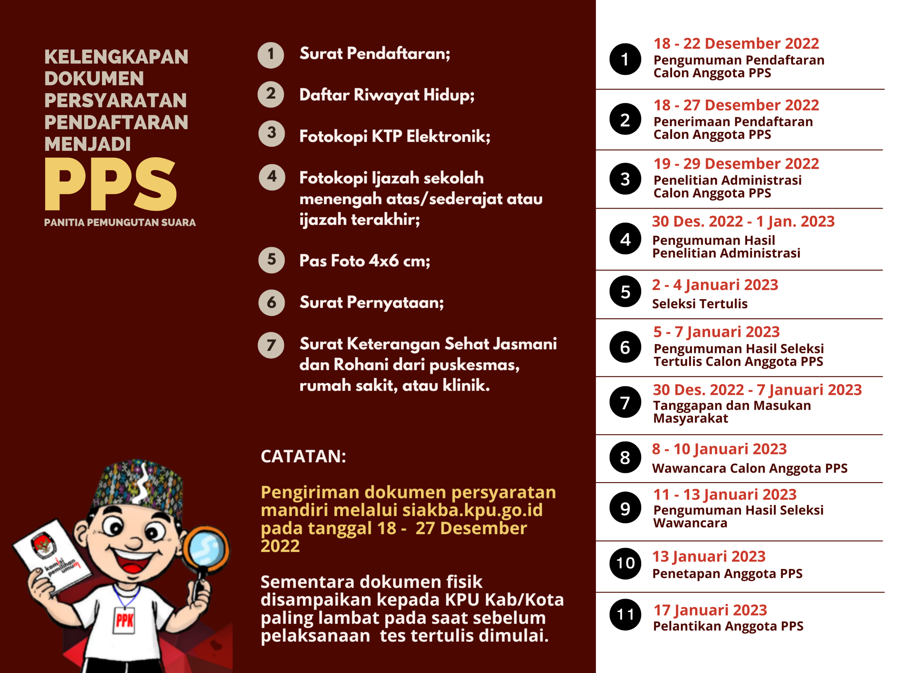 KPU Kabupaten/Kota melakukan Verifikasi Administrasi terhadap surat pernyataan dugaan keanggotaan ganda dan keanggotaan yang berpotensi belum memenuhi syarat dari Partai Politik pada Senin, 5 September 2022 sampai dengan Kamis, 8 September 2022