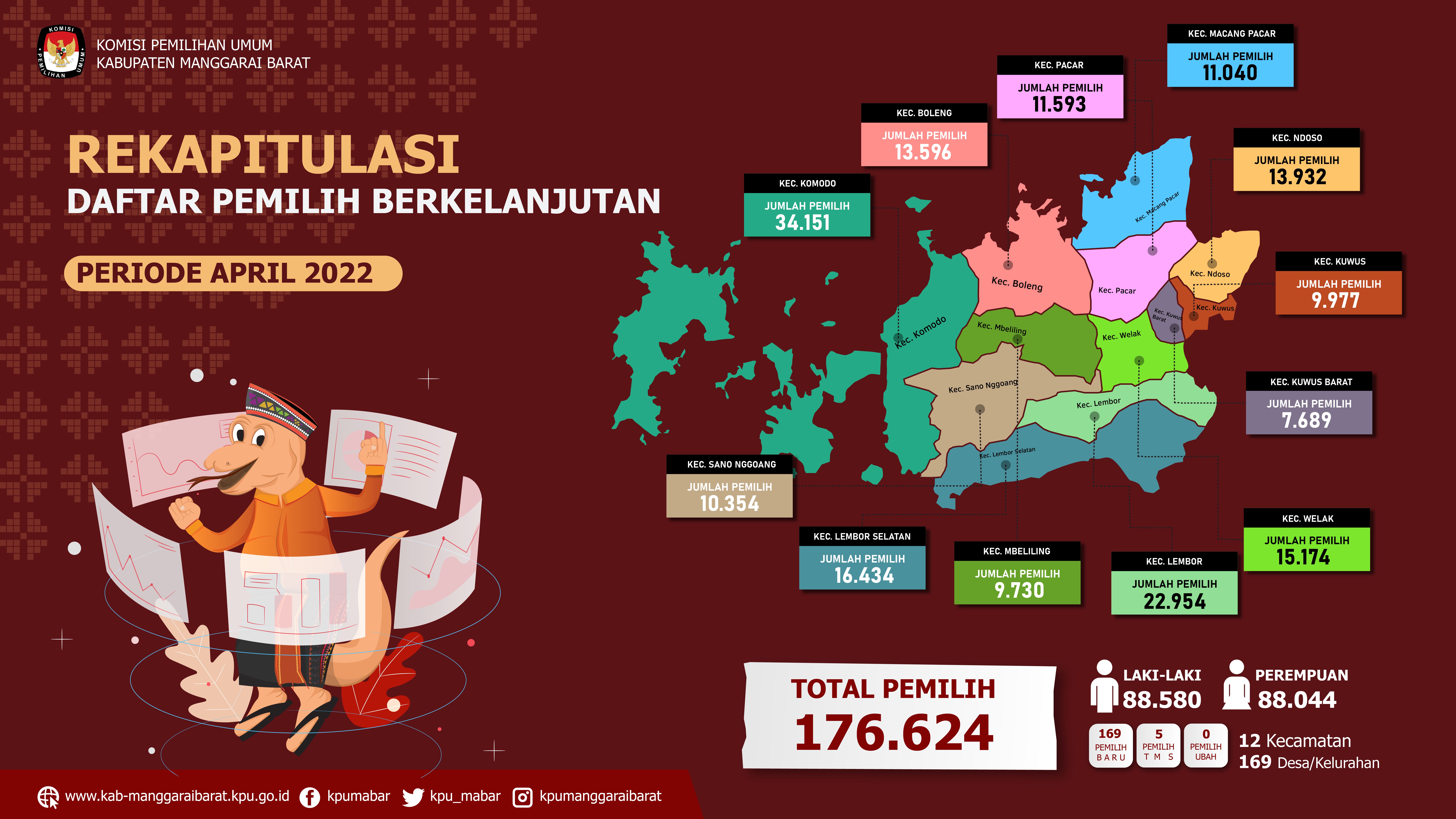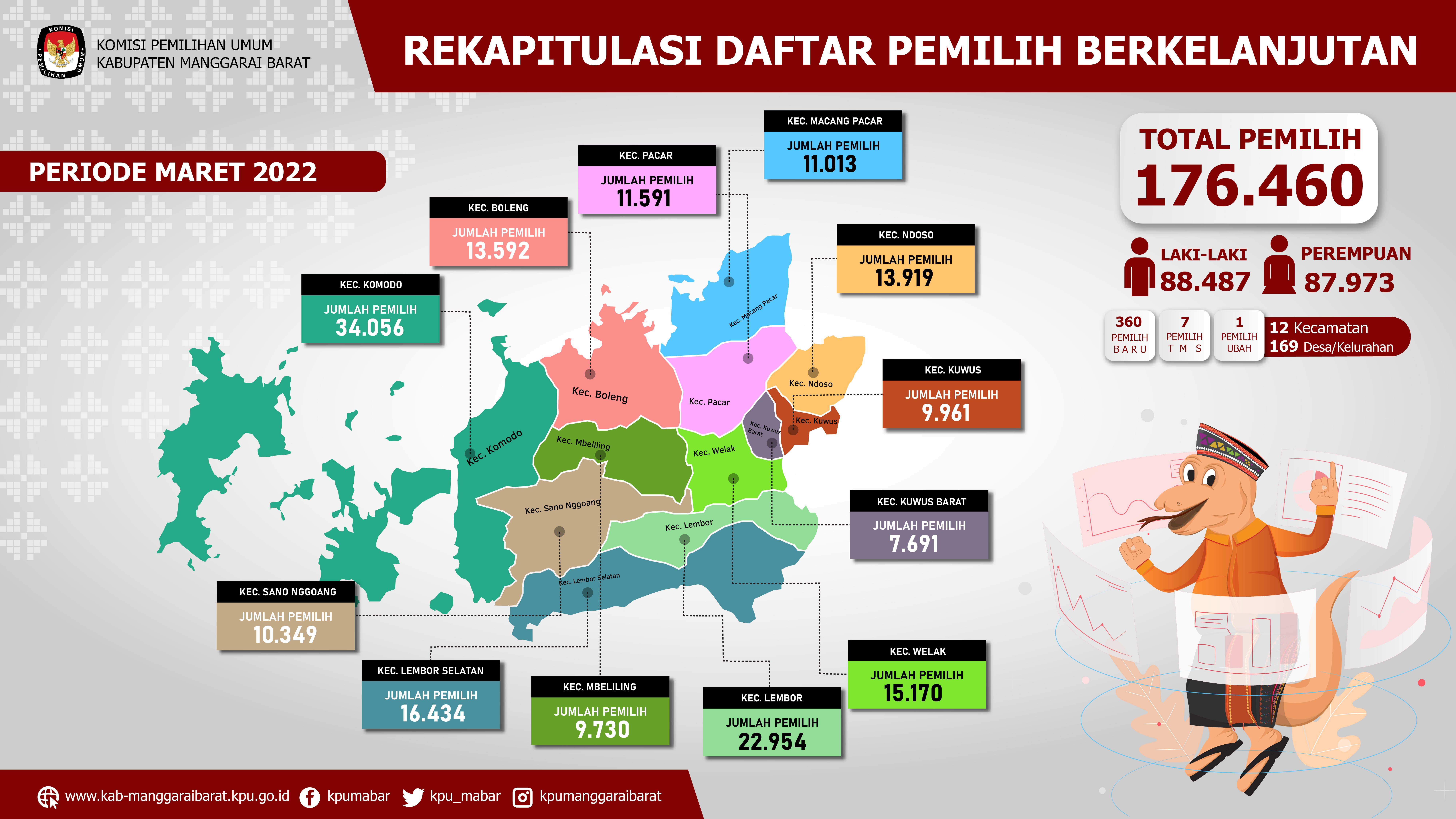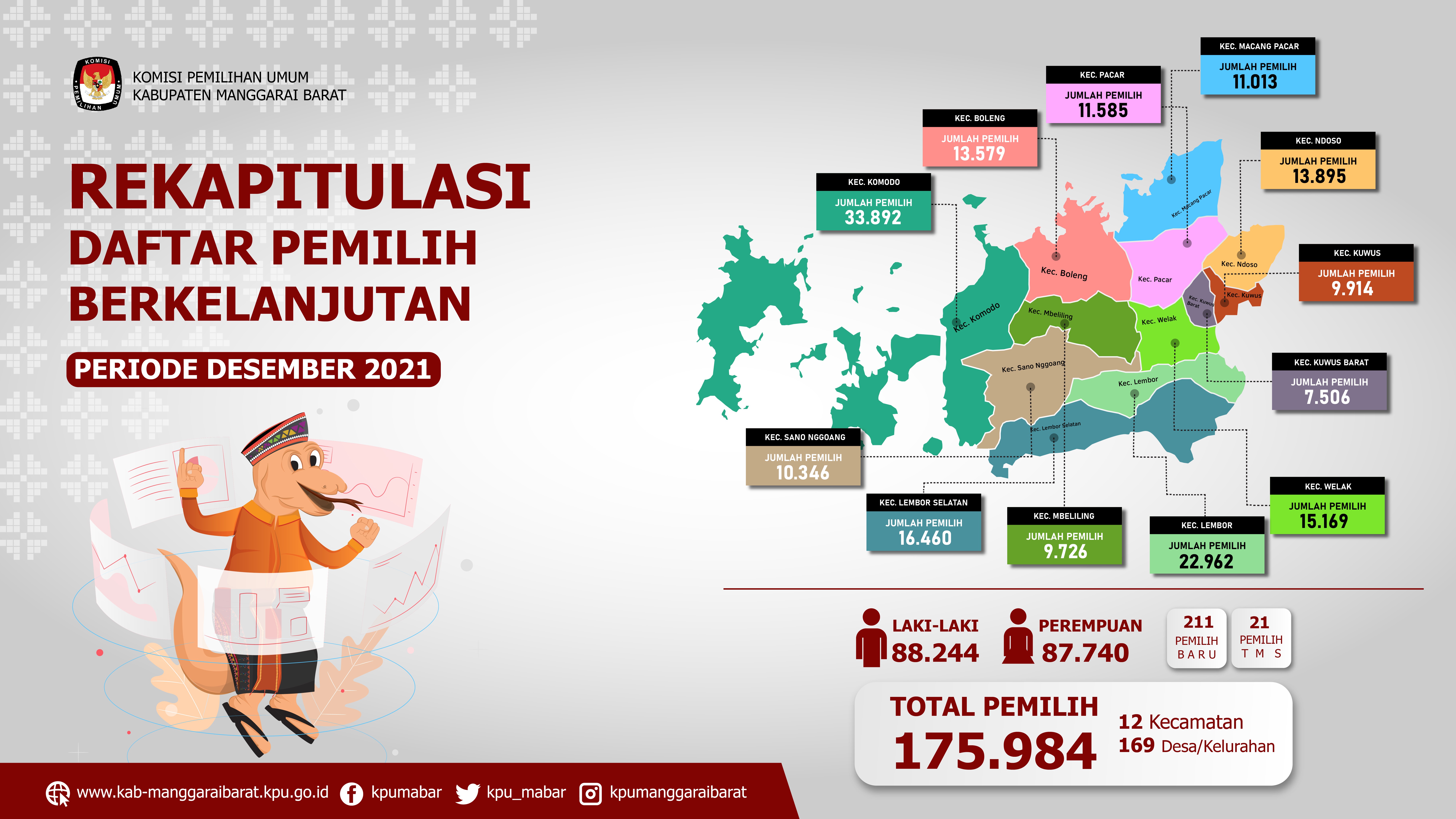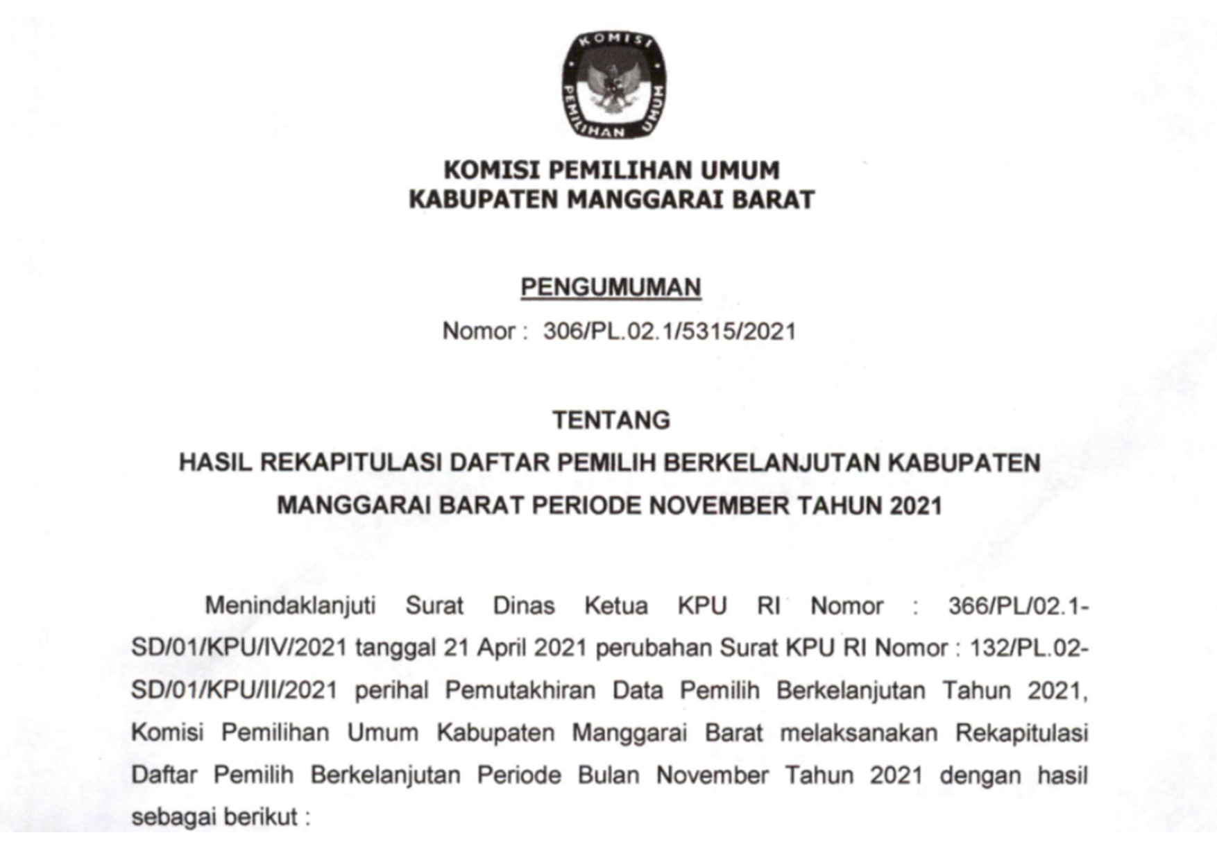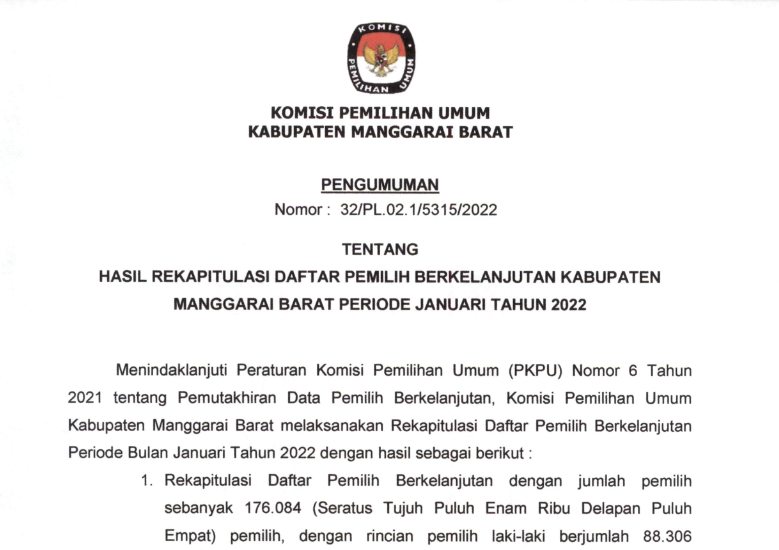 Menindaklanjuti Surat Dinas Ketua KPU RI Nomor : 366/PL/02.1-SD/01/KPU/IV/2021 tanggal 21 April 2021 perubahan Surat KPU RI Nomor : 132/PL.02-SD/01/KPU/II/2021 perihal Pemutakhiran Data Pemilih Berkelanjutan Tahun 2021, Komisi Pemilihan Umum Kabupaten Manggarai Barat melaksanakan Rekapitulasi Daftar Pemilih Berkelanjutan Periode Bulan Desember /Triwulan IV Tahun 2021 dengan hasil dapat diunduh di bawah ini: