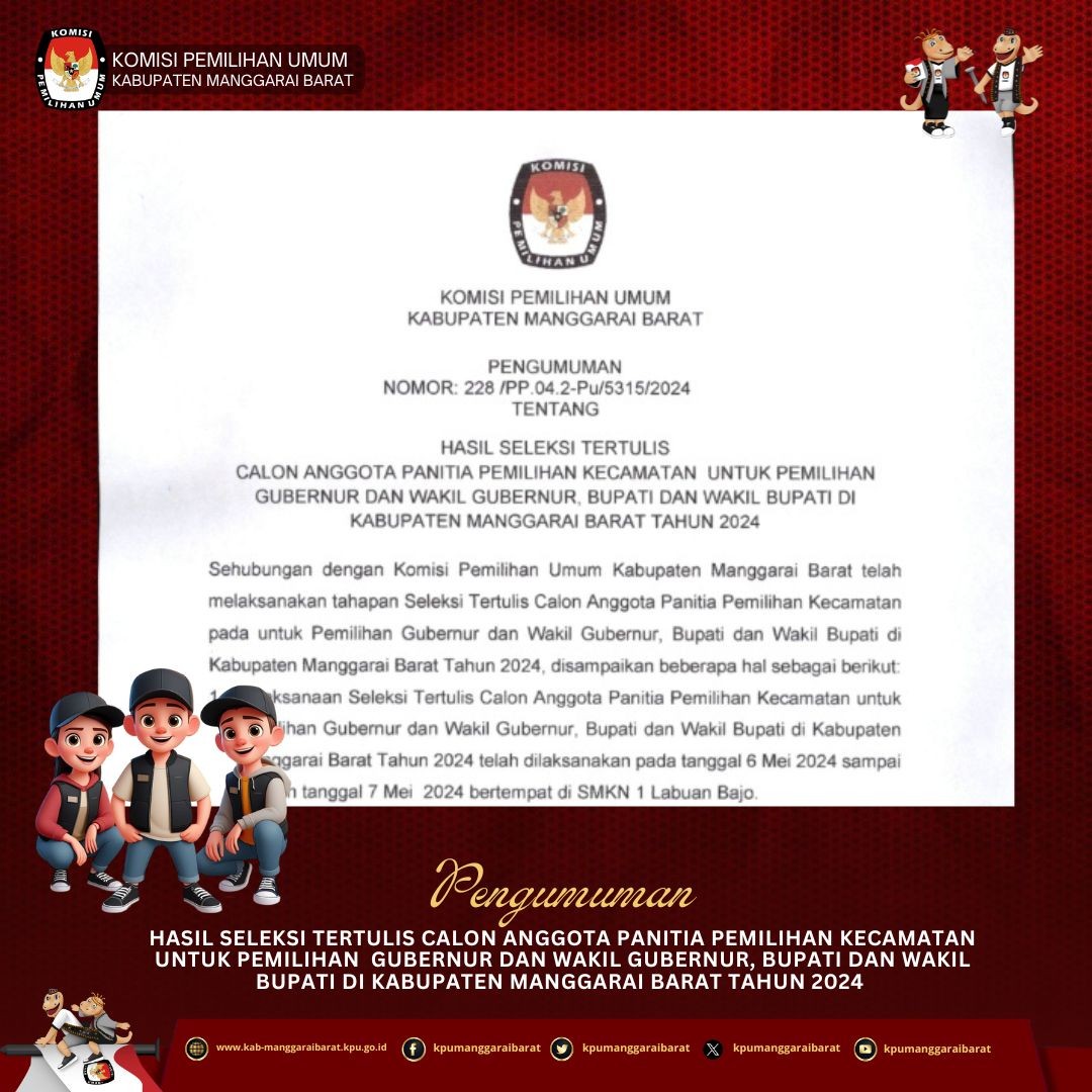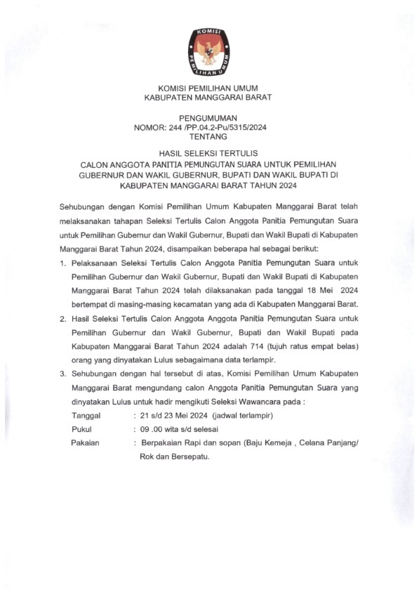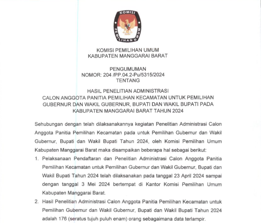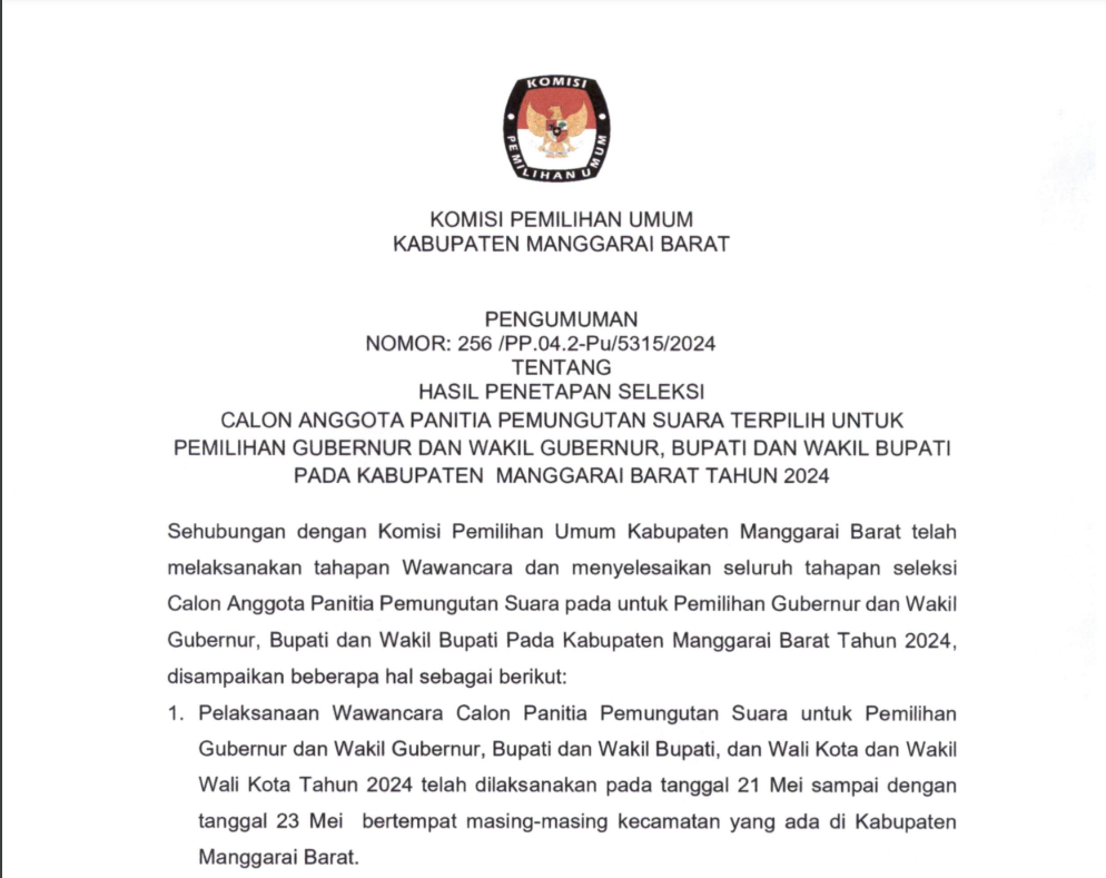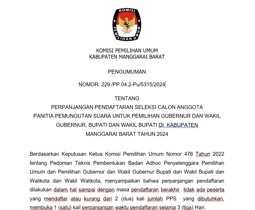 Berdasarkan ketentuan tersebut di atas, maka Komisi Pemilihan Umum Kabupaten Manggarai Barat mengumumkan Jadwal Penyerahan Syarat Dukungan Bakal Pasangan Calon Perseorangan Bupati dan Wakil Bupati Kabupaten Manggarai Barat Pemilihan Serentak Tahun 2024 sebagaimana Pengumuman terlampir pada link di bawah ini :