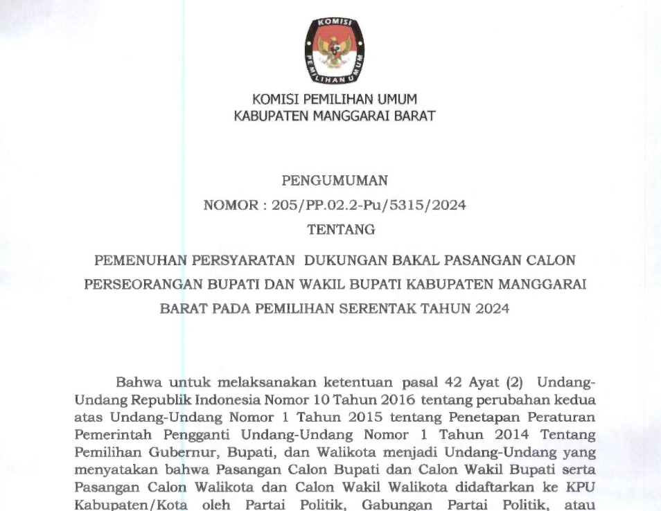 Bahwa untuk melaksanakan ketentuan pasal 42 Ayat (2) Undang-Undang Republik Indonesia Nomor 10 Tahun 2016 tentang perubahan kedua atas Undang-Undang Nomor 1 Tahun 2015 tentang Penetapan Peraturan Pemerintah Pengganti Undang-Undang Nomor 1 Tahun 2014 tentang Pemilihan Gubernur, Bupati, dan Walikota menjadi Undang-Undang yang menyatakan bahwa Pasangan Calon Bupati dan Calon Wakil Bupati serta Pasangan Calon Walikota dan Calon Wakil Walikota didaftarkan ke KPU Kabupaten/Kota oleh Partai Politik, Gabungan Partai Politik, atau Perseorangan dan Peraturan Komisi Pemilihan Umum Nomor 2 Tahun 2024 tentang Tahapan dan Jadwal Pemilihan Gubernur dan Wakil Gubernur, Bupati dan Wakil Bupati, serta Walikota dan Wakil Walikota Tahun 2024 juga Surat Dinas Ketua Komisi Pemilihan Umum Republik Indonesia Nomor 676/PL.02.2-SD/05/2024 perihal Persiapan Penyerahan Syarat Dukungan Bakal Pasangan Calon Perseorangan pada Pemilihan Serentak Tahun 2024 tanggal 4 Mei 2024 serta Keputusan Komisi Pemilihan Umum Kabupaten Manggarai Barat Nomor 549 Tahun 2024 tentang Syarat Minimal dan Persebaran Dukungan Bakal Pasangan Calon Perseorangan dalam Pemilihan Bupati dan Wakil Bupati Manggarai Barat Tahun 2024.