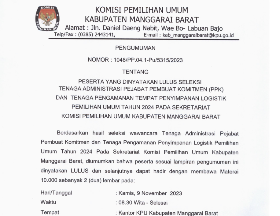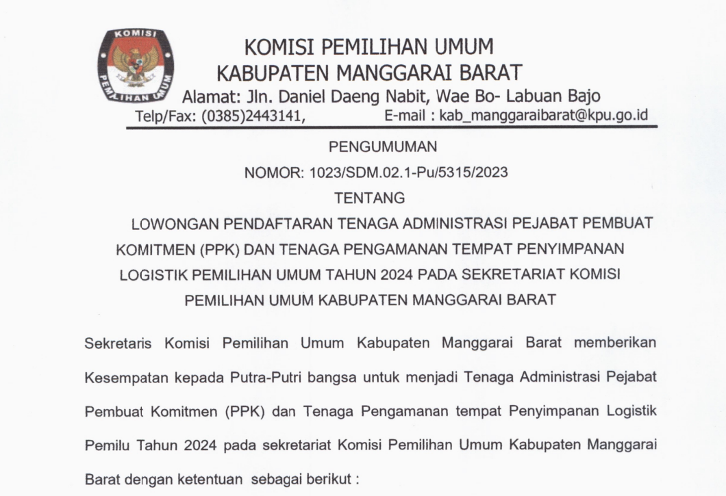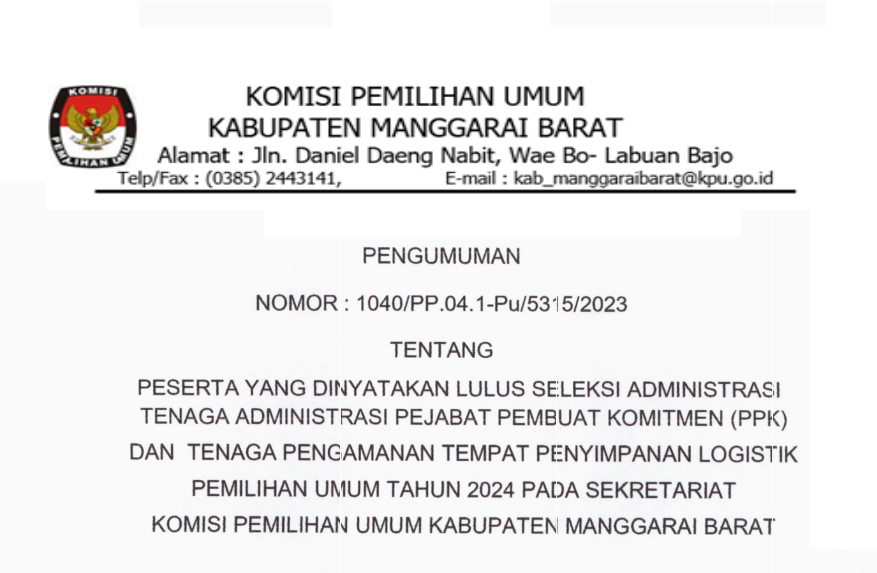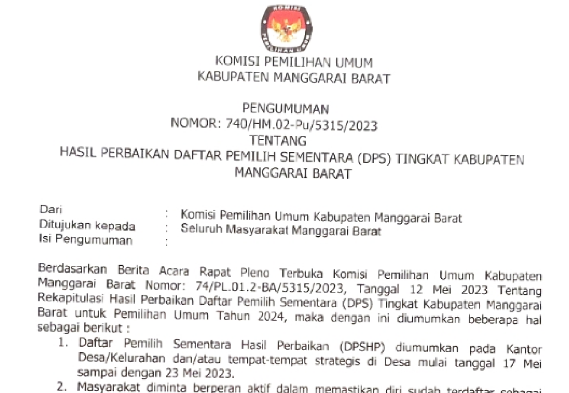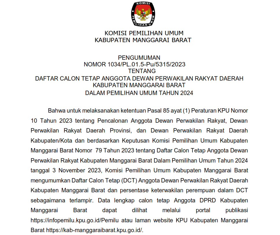 PENGUMUMAN NOMOR 898/PL.01.4-Pu/5315/2023 TENTANG DAFTAR CALON SEMENTARA ANGGOTA DPRD KABUPATEN MANGGARAI BARAT DALAM PEMILIHAN UMUM TAHUN 2024