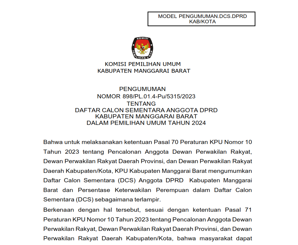 Bahwa untuk melaksanakan ketentuan Pasal 70 Peraturan KPU Nomor 10 Tahun 2023 tentang Pencalonan Anggota Dewan Perwakilan Rakyat, Dewan Perwakilan Rakyat Daerah Provinsi, dan Dewan Perwakilan Rakyat Daerah Kabupaten/Kota, KPU Kabupaten Manggarai Barat mengumumkan Daftar Calon Sementara (DCS) Anggota DPRD Kabupaten Manggarai Barat dan Persentase Keterwakilan Perempuan dalam Daftar Calon Sementara (DCS) sebagaimana terlampir.